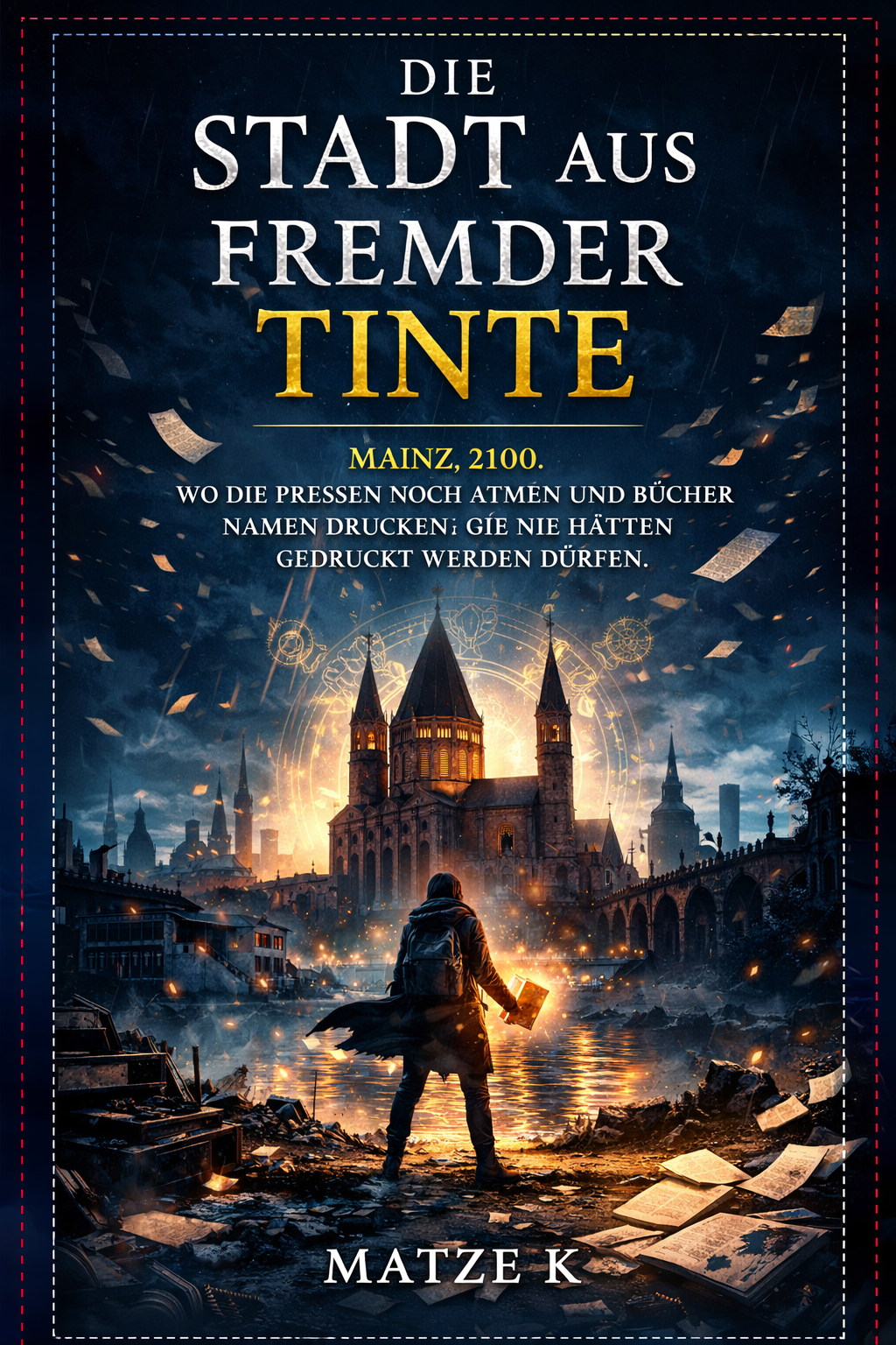 Die Stadt aus fremder Tinte ist eine düstere Dark-Fantasy-Geschichte mit emotionaler Wucht, atmosphärischer Stadtbindung und gesellschaftlichen Bruchlinien. Zwischen Mainzer Altstadt, Dom, Markt, Augustinerstraße und Winterhafen entfaltet sich ein Roman über Macht, Erinnerung, Klimafolgen, moralische Grenzräume und die Frage, ob Liebe zu einem Ort jemals bedeuten darf, sich von ihm verschreiben zu lassen.