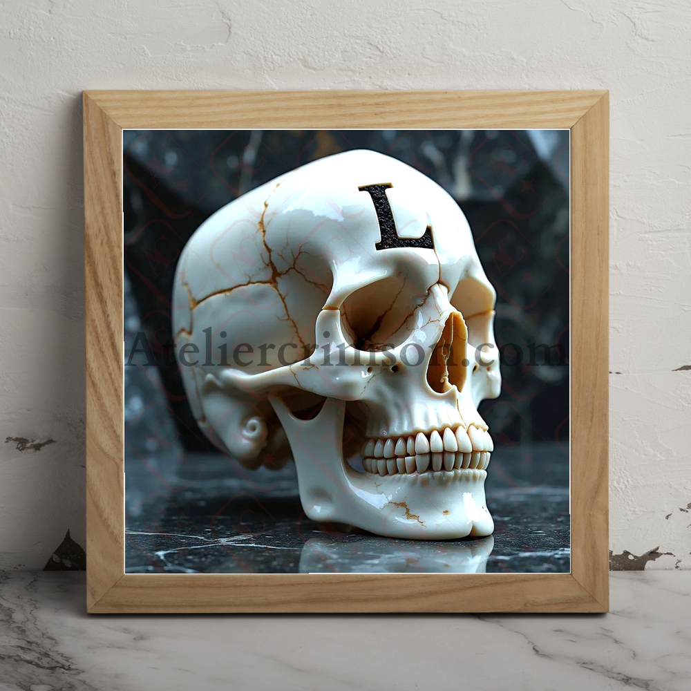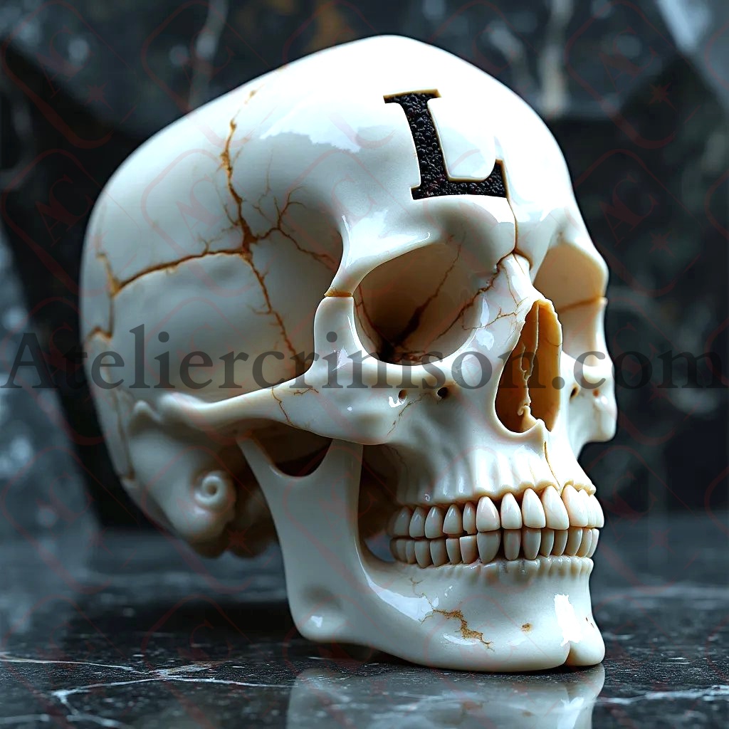 The letter L skull obsidian marble deeply engraved character on the forehead of a white marble skull. The character, filled with dark obsidian, contrasts sharply against the pale skull. Set against a black crystalline background, the skull and character dominate the image.