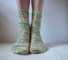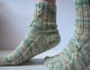Les chaussettes sont tricotées de haut en bas. Elles commencent avec des côtes 2x2, puis le motif torsadé est tricoté sur la jambe. Le motif est seulement présenté sous forme de grille, et il est différent pour les deux jambes. Un talon rond est tricoté et le motif torsadé est continué au-dessus du pied, le dessous étant tricoté en jersey. Quand le motif est terminé, le dessus du pied est tricoté en jersey envers et vous pouvez donc facilement adapter le nombre de rangs pour ajuster ces chaussettes à la taille de votre pied.