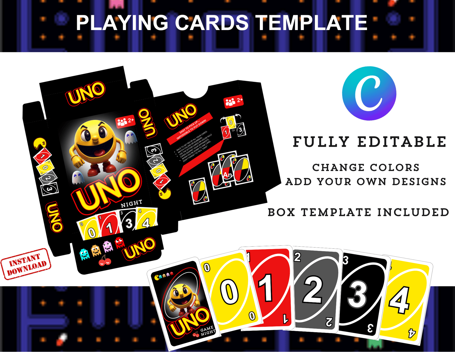 You will receive a customizable template that includes 60 UNO cards, 1 back card design template, and box templates. Templates can be easily edited to fit any theme within Canva. Turn your game nights into unforgettable memories by getting your template today!