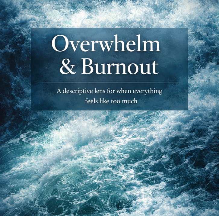 Overwhelm & Burnout describes the nervous-system state that can follow prolonged strain, overextension, or sustained pressure. It offers language that normalizes fatigue and depletion without framing them as failure or requiring recovery strategies.