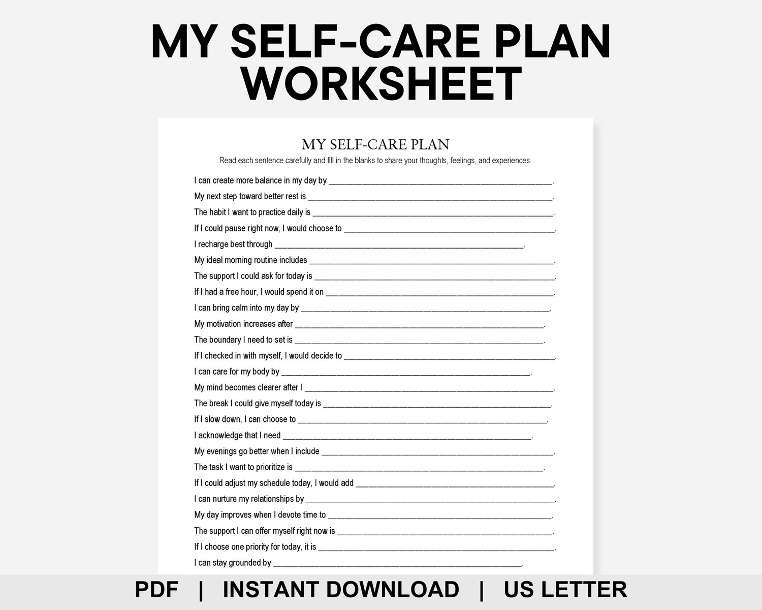 Give yourself the care you deserve. This My Self-Care Plan worksheet features 30 prompts to help you define your needs and take meaningful steps for your overall health. Use it for therapy sessions, journaling, or self-reflection to put yourself first and enjoy life more fully. Happy planning and happy self-caring!