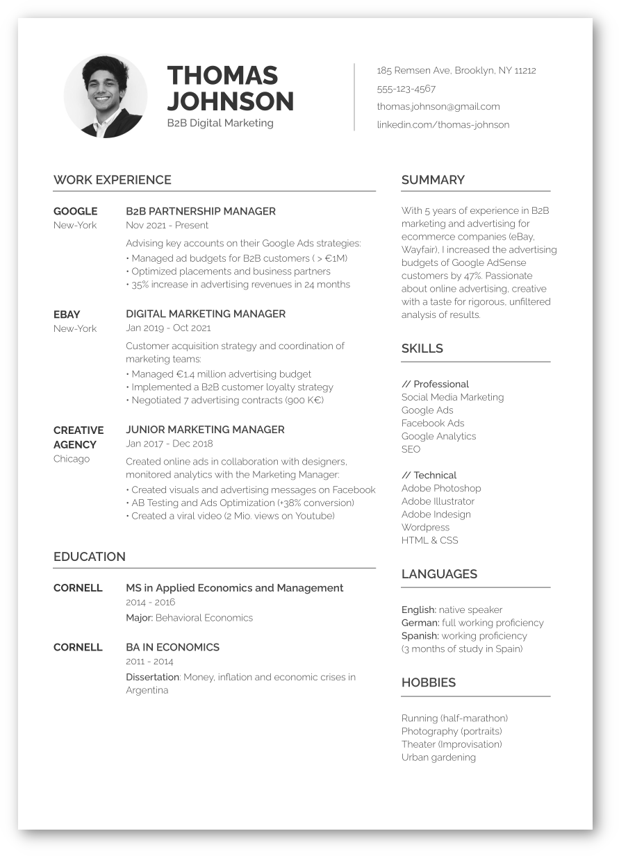 This black and white, clean, modern, minimalist resume template is designed to help you land the job of your dreams. Simple to use, easy to customize and pre-filled to help you write your CV quickly.