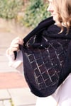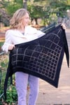 Diamond is the compact and dense allotrope, or distinct structural element, that forms from carbon at very high pressure. This shawl is a lattice of interlocking cubic shapes in garter stitch and yarnovers, worked from the bottom up in an expanding structure. Wide garter borders on all sides create a simple frame for the strong and striking geometry of the diamond arrangement.