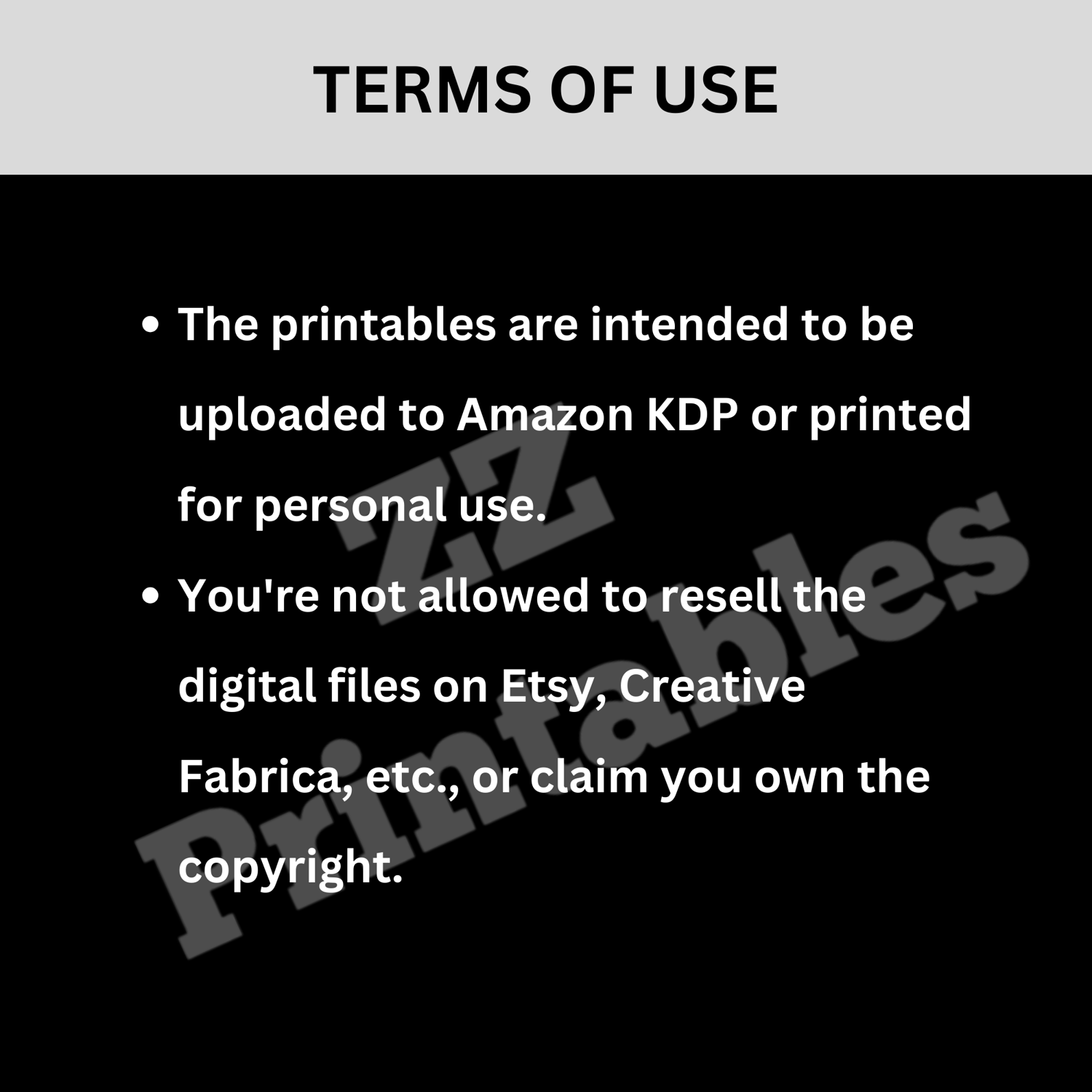 The printables are intended to be uploaded to Amazon KDP or printed for personal use. You're not allowed to resell the digital files on Etsy, Creative Fabrica, etc., or claim you own the copyright.