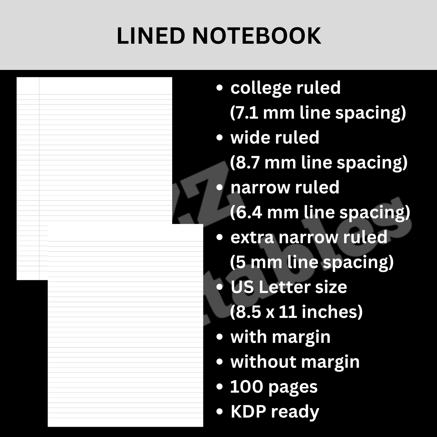 • 2 narrow ruled (6.4 mm line spacing) notebook - 8.5" x 11" (with and without 1.25" margin)