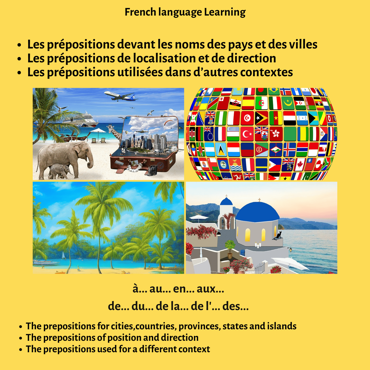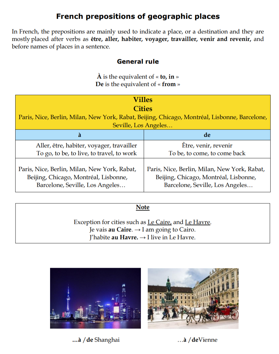 This product contains the prepositions used in French for places like cities, countries, states, and islands. You also learn the prepositions used for other contexts. I made the explanation easy to help you to use each preposition correctly. There are also many examples for each context (location, position, direction) in French and English for faster understanding and better assimilation. As a result, you might want to have it.