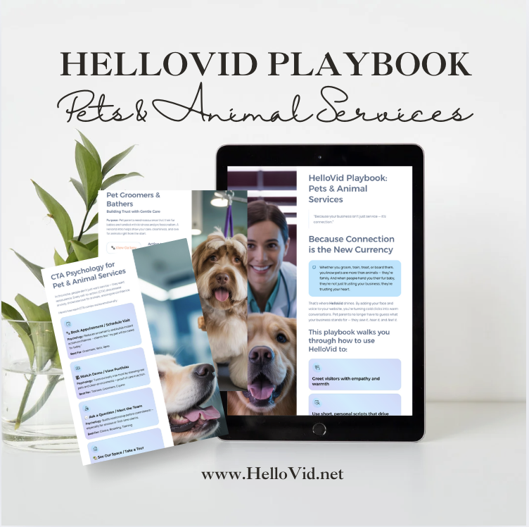 This beautifully designed 14-page eBook is your insider’s guide to using HelloVid, the human-video widget that transforms ordinary pet service websites into personal, trust-building experiences. Whether you groom, train, treat, or board, this playbook walks you step-by-step through:
