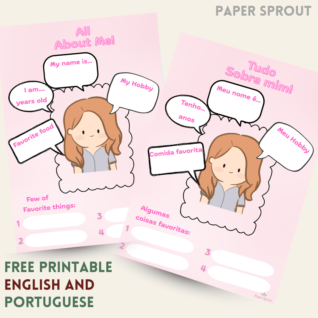 This fun and colorful All About Me printable is entirely in Portuguese and designed especially for girls! It encourages children to write and draw about their favorite things, hobbies, family, and dreams, helping them express themselves in a creative and meaningful way.
