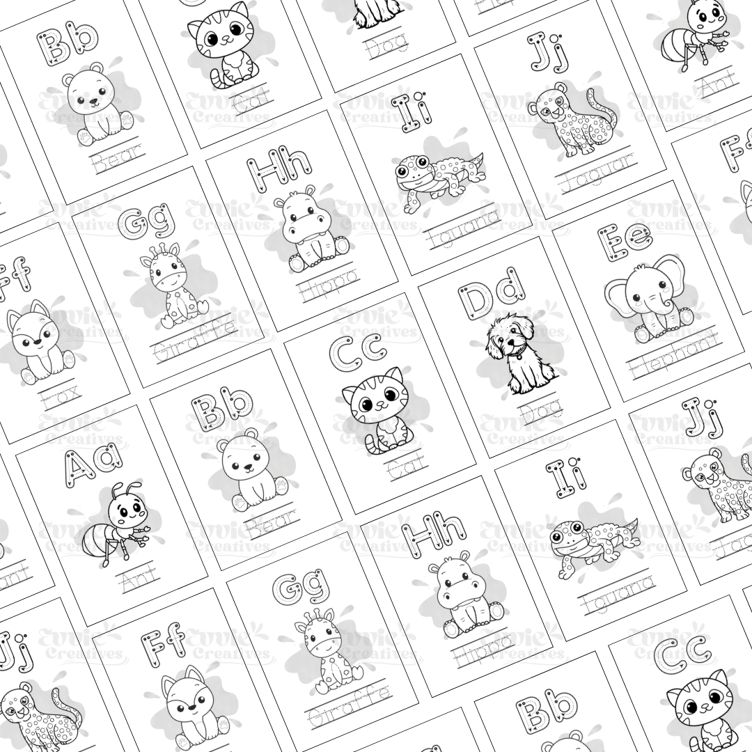 Each A4-sized page features a letter of the alphabet, a corresponding animal, and a tracing activity for the animal’s name, making it a perfect blend of coloring fun and handwriting practice.