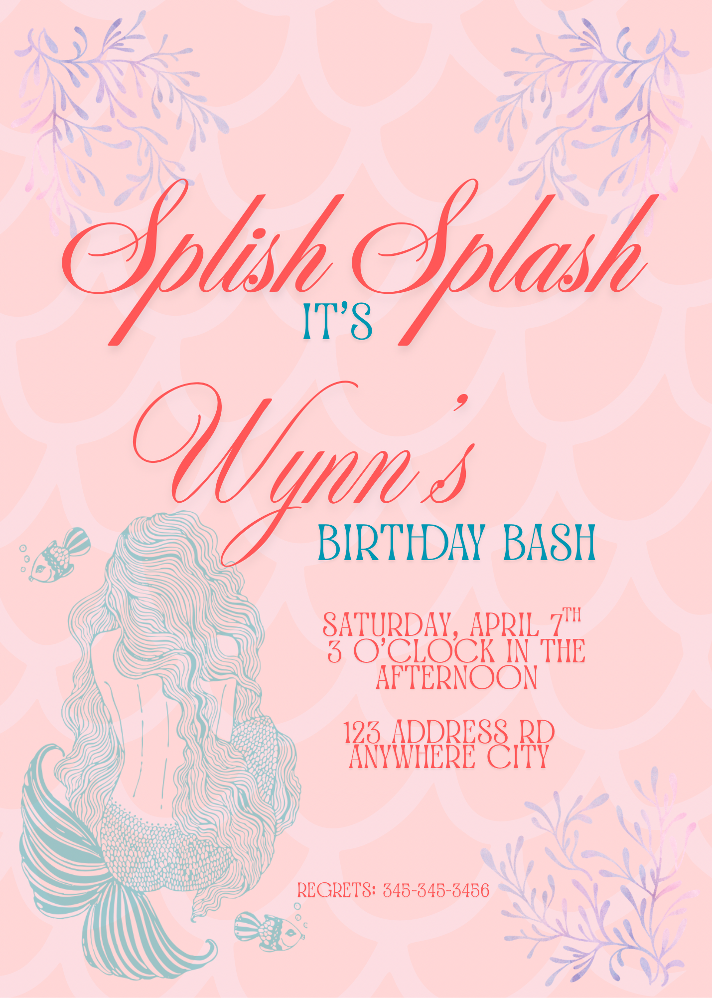 Splish Splash Mermaid Bash Birthday Party Editable Invitation Template
