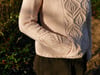 A flattering jumper knitted from the bottom-up, with a simple leaf lace pattern and an integrated pocket.