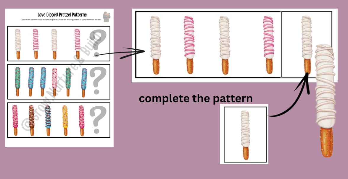 This printable includes pretzel pattern cards with a missing piece and matching pretzel cut-outs for toddlers to complete each pattern. Children choose a card and place the missing pretzel to finish the sequence, encouraging learning through choice and play.