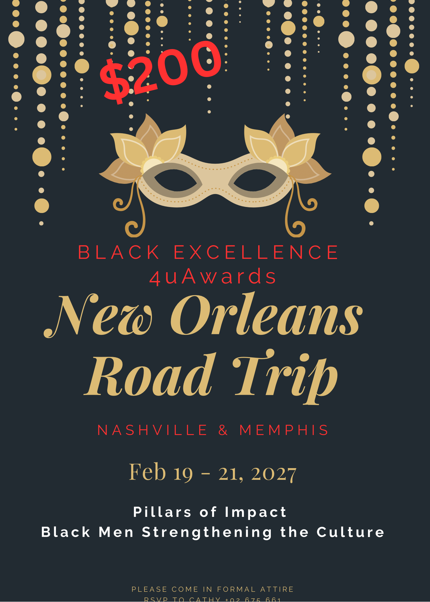 Get ready for an unforgettable journey to the Black Excellence 4uAwards Masquerade Experience in New Orleans—where culture, elegance, and purpose come together.