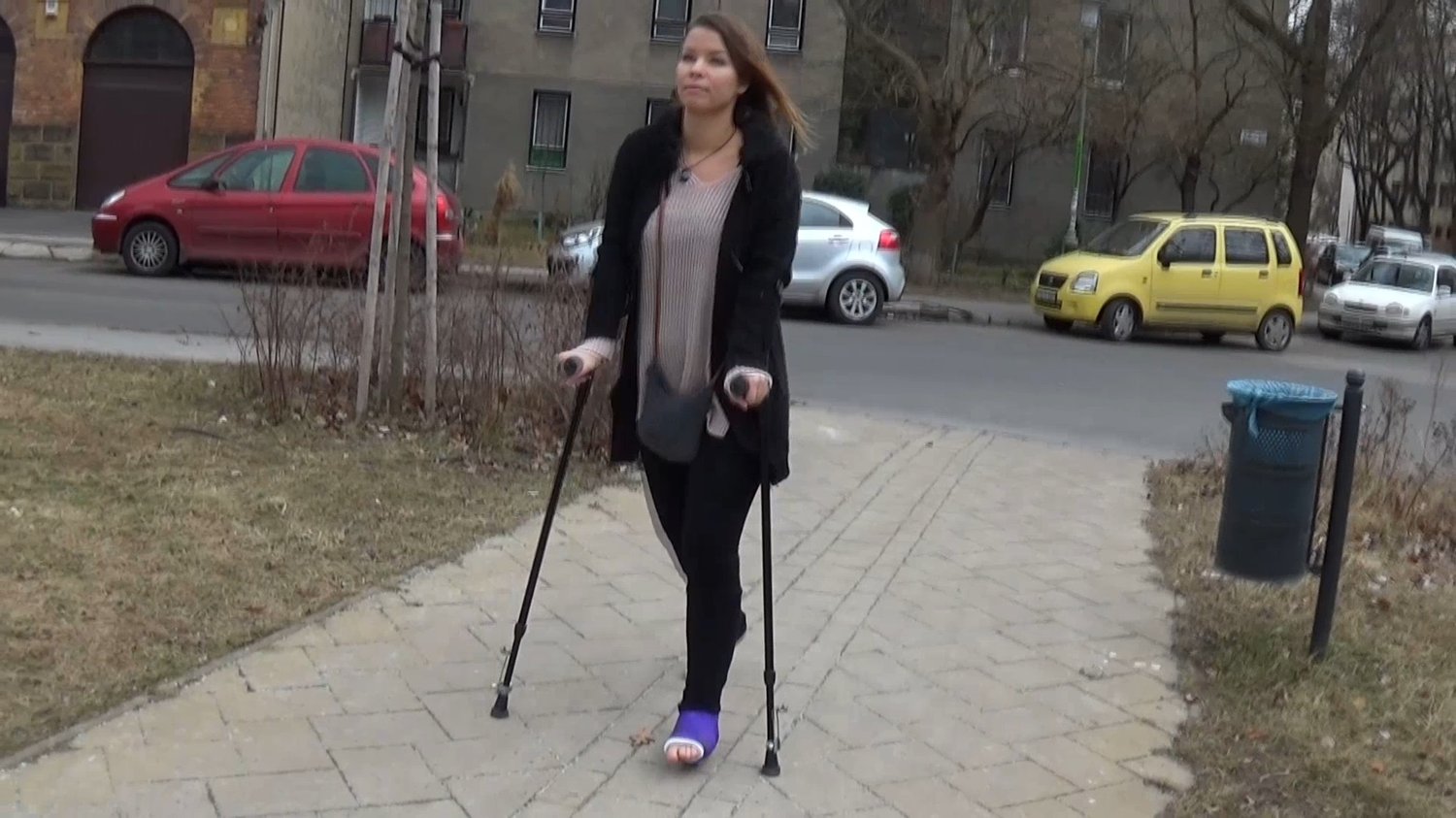Lucy is out walking on her short leg walking cast using her crutches as support.She find a bench and when she sits down to rest we talk we take a really closer look at her cast.After a while, she arrives at a basketball court where she puts one crutch aside and tries to play a little with the poorly pumped ball she finds.