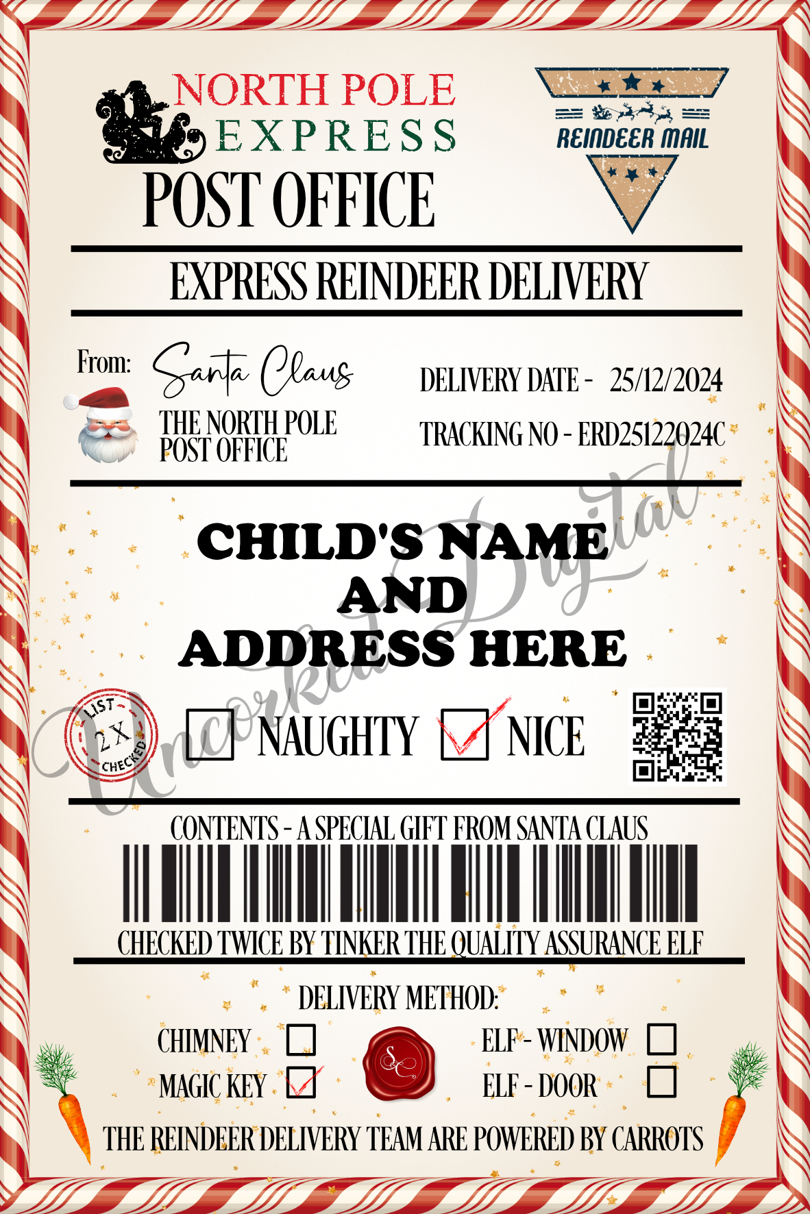 Santa's postage label, express reindeer delivery with years 2025 and 2026 included, with a separate red tick for you to place in the appropriate delivery method box.