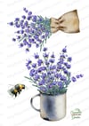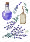Set of lavender bouquets and elements: glass bottle with lavender oil, iron mug, sachet, paper tag, bee