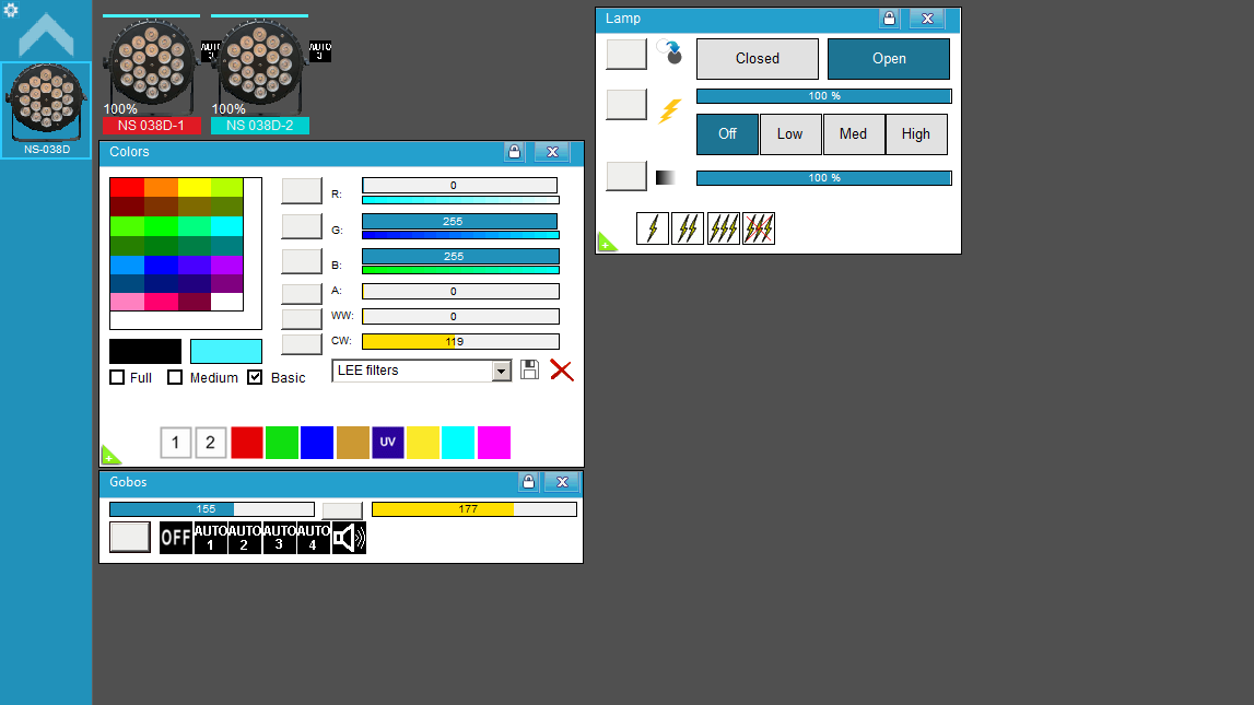 • Acceso directo a colores básicos: Blanco Puro, Blanco Full, Rojo, Verde, Azul, Ambar, UV, Amarillo, Celeste y Magenta.