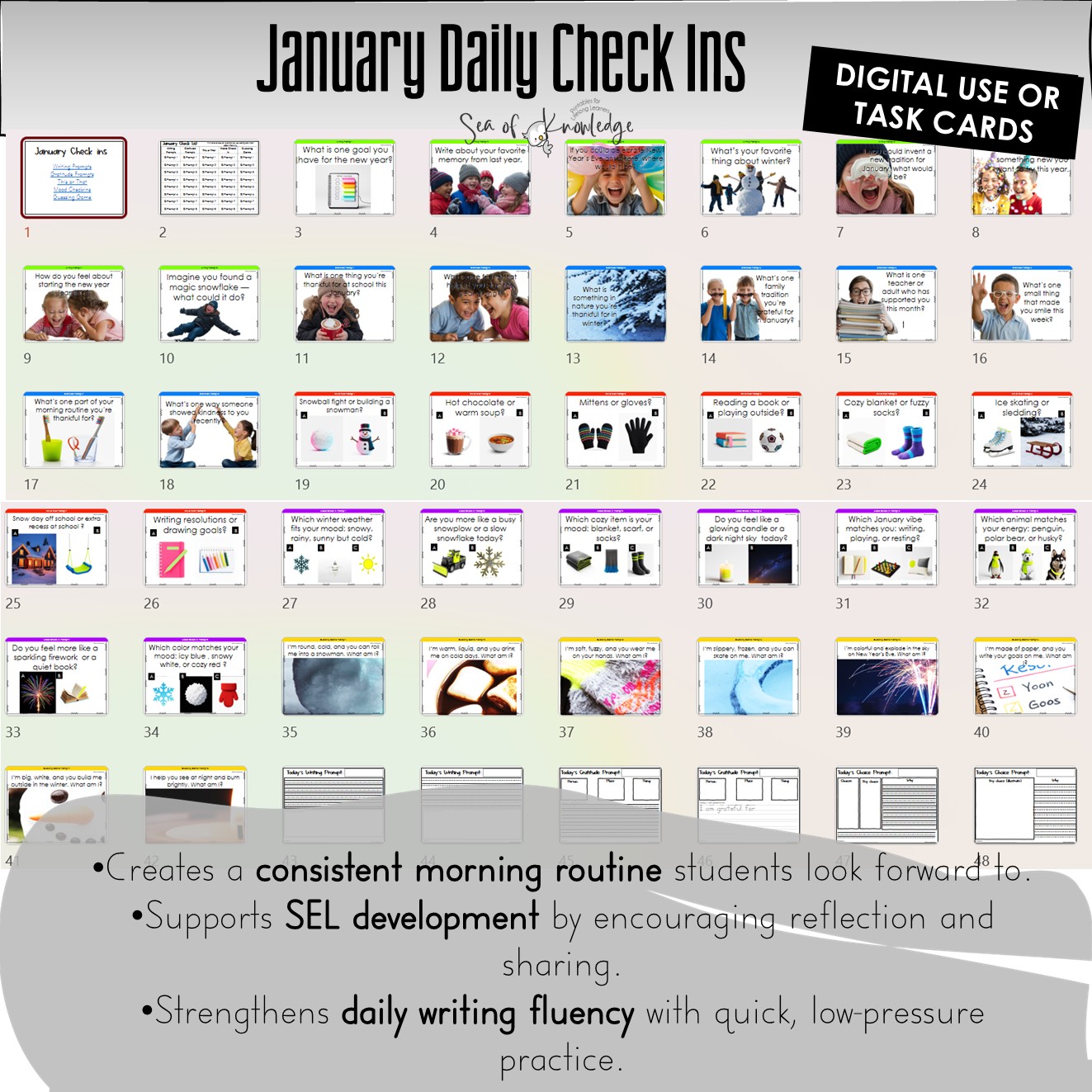 january morning meeting, january daily check ins, january writing prompts, january classroom activities, new year writing prompts, new year classroom activities, winter morning meeting prompts, daily sel check ins, january check in slides, gratitude prompts january, student mood check in january, january discussion prompts, writing warm up prompts january, daily reflection prompts january, january classroom community building, this or that january edition, fun morning meeting slides january, january morning work ideas, january circle time activities, social emotional learning prompts january, esl january prompts, esl winter vocabulary activity, student check in template january, daily bell ringer activities january, winter writing prompts for kids, new year resolution prompts kids, january journal prompts, january classroom routines, january sel morning meeting, january daily slides for teachers