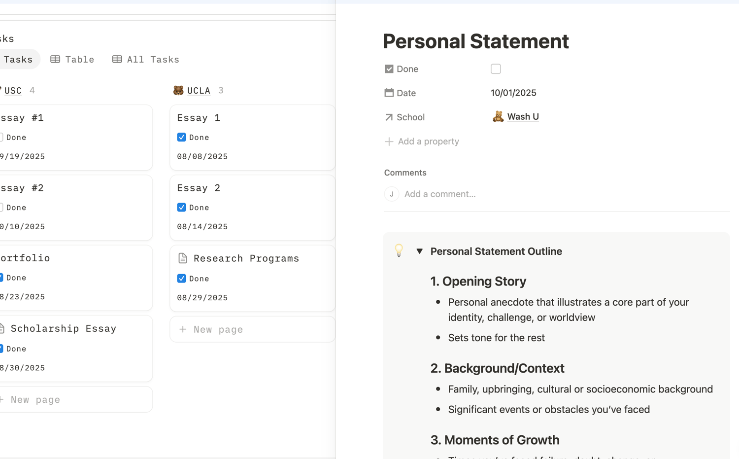 Shows all essays and deliverables per school. Keep it updated to stay on top of deadlines and sync your application tracker.