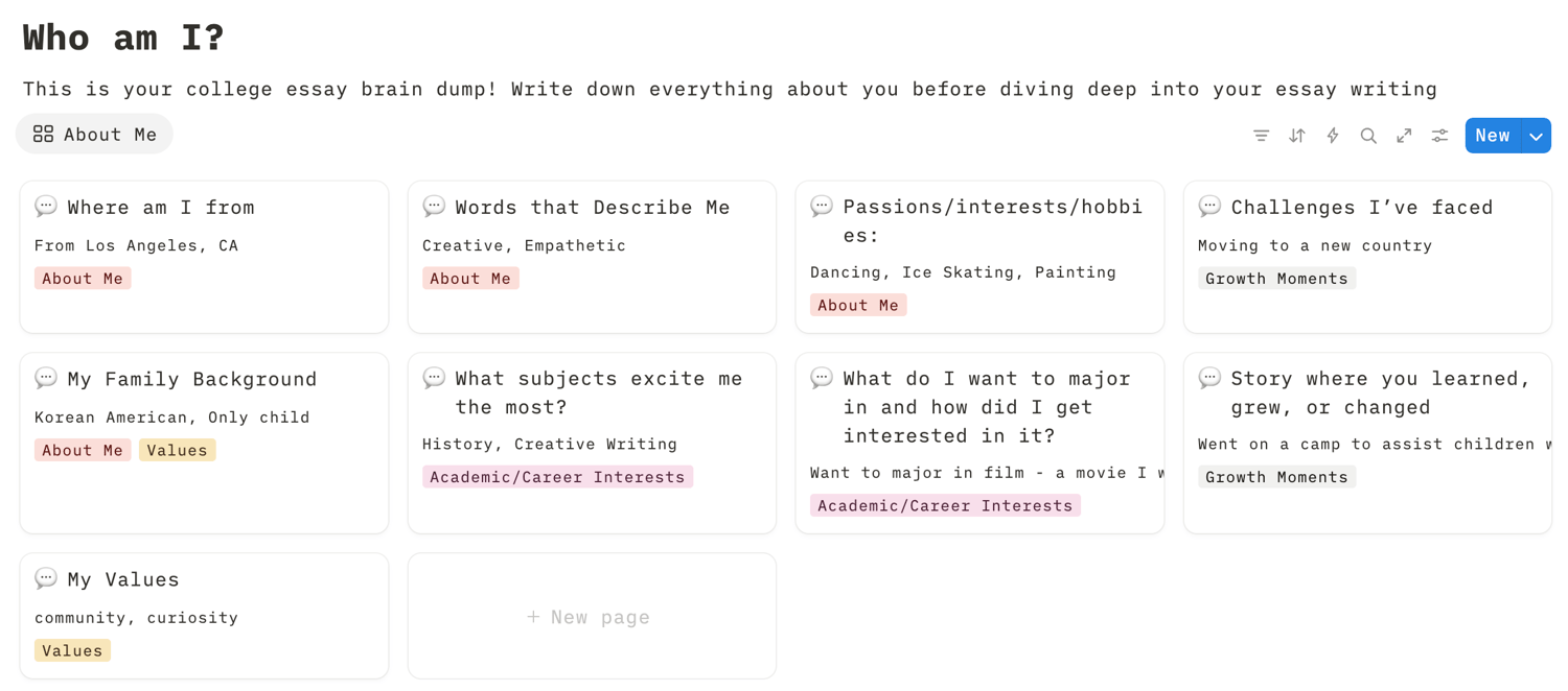Answer prompts about your identity, values, and goals. These cards help you build strong Personal Statements and SOPs.