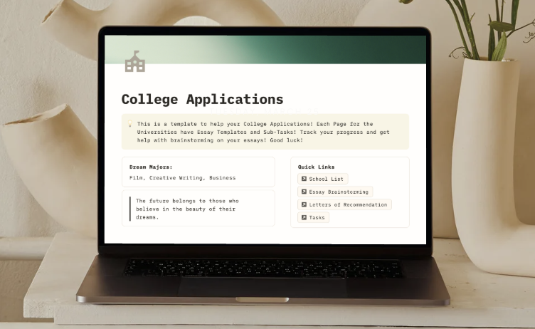 This Notion template helps you manage every step of your college application journey — from researching schools and writing essays to tracking tasks and recommendation letters. Use it as your all-in-one hub to stay organized and reduce stress.