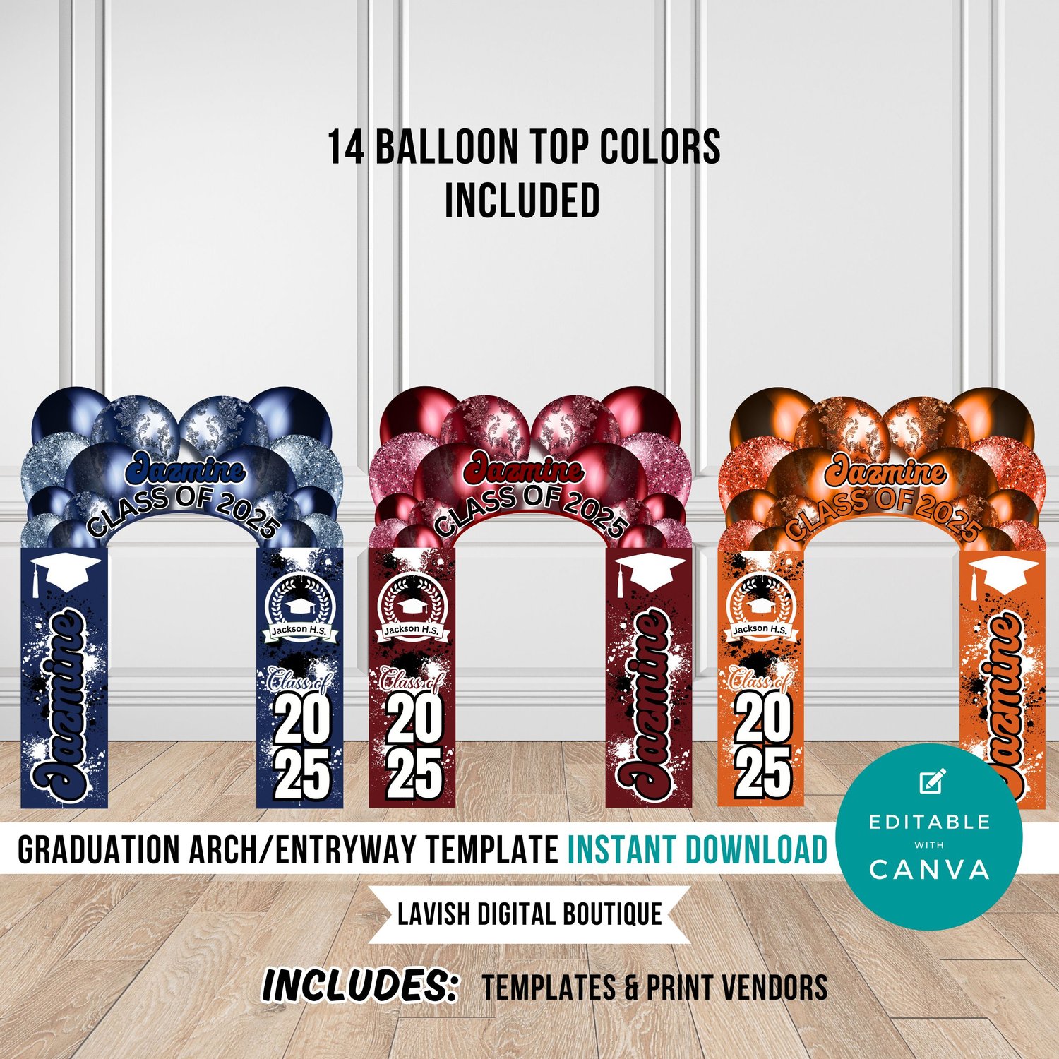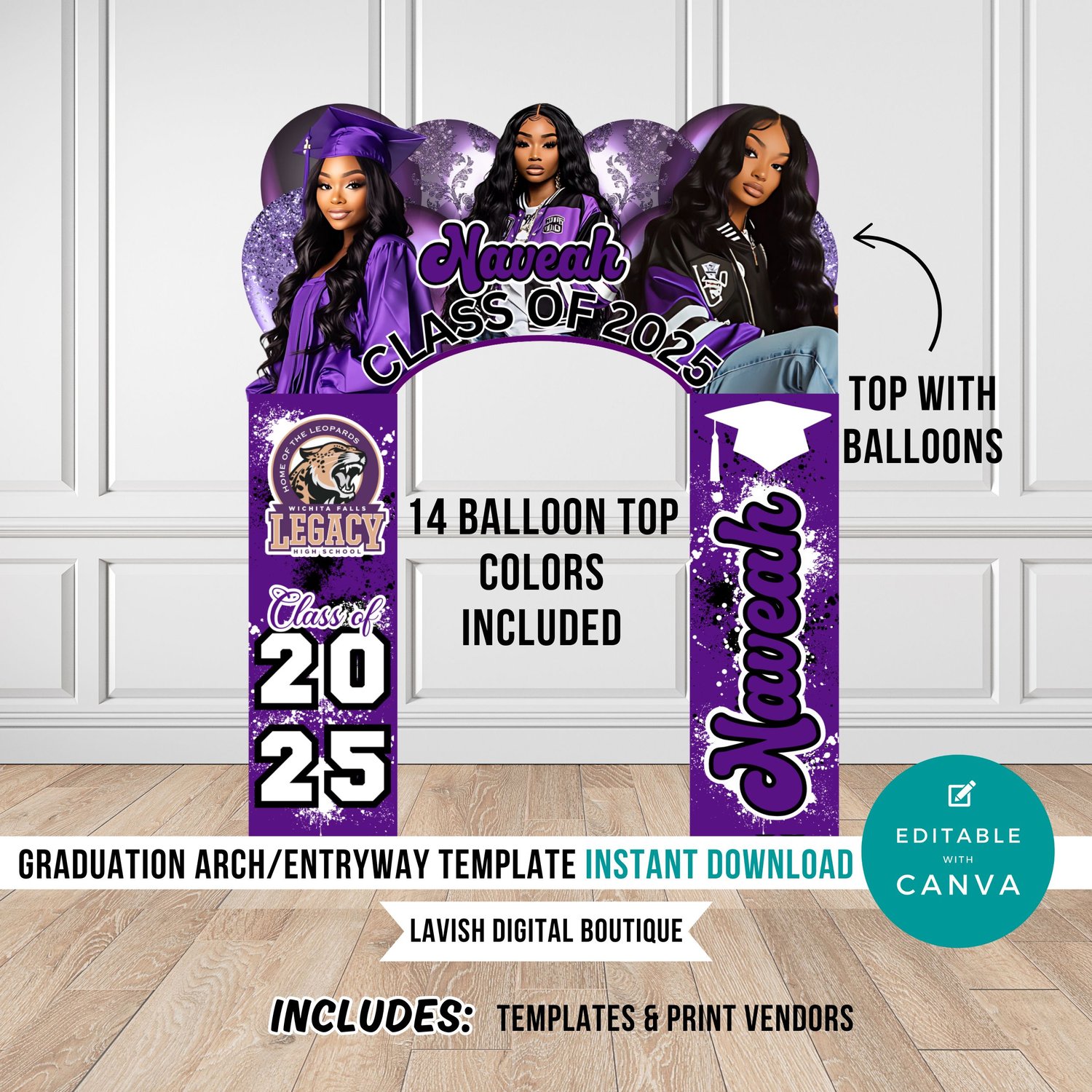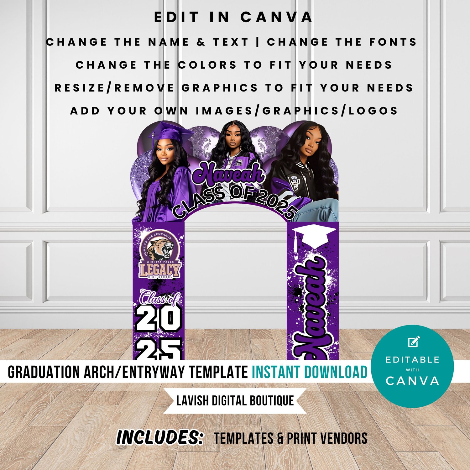 This listing is for 1 digital Grad entrance/ Arch design templates that you can edit using Canva. The designs are editable in Canva, so you can change the text, font, colors, and graphics to suit your style. You can even add your own images or logo to make it truly unique. The file is layered for easy editing, but Canva experience is necessary.