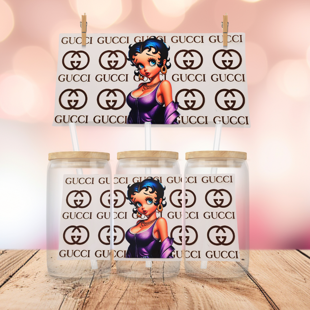 Serve glam and confidence with this G-inspired wrap featuring Miss B rocking a fierce purple tank top! Designed to fit 16 oz Libbey glass cups or tumblers, this wrap is the perfect blend of high fashion and bold personality—ideal for boutique drinkware or custom gift sets.