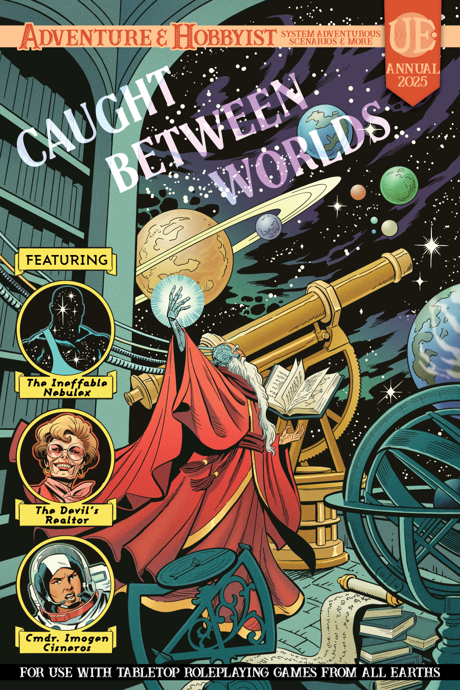 The Adventure & Hobbyist Annual is a collection of system-adventurous scenarios, maps and more for use with your favorite tabletop roleplaying games. This is a 92-page PDF with full-color interior layout and illustrations, as well as home-printable files for the Perpetual Library.