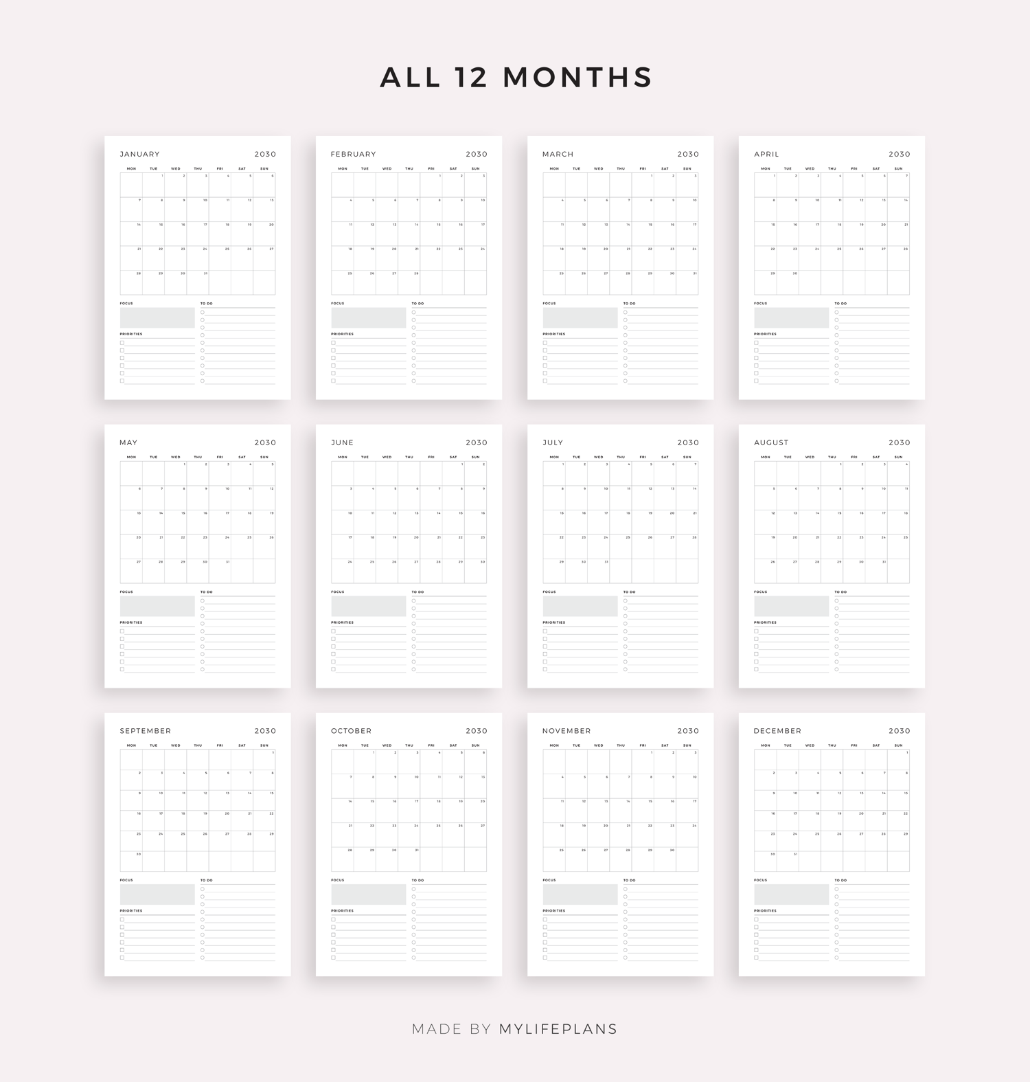 This is a printable 2030 monthly planner — just download, print, and start using it right away.