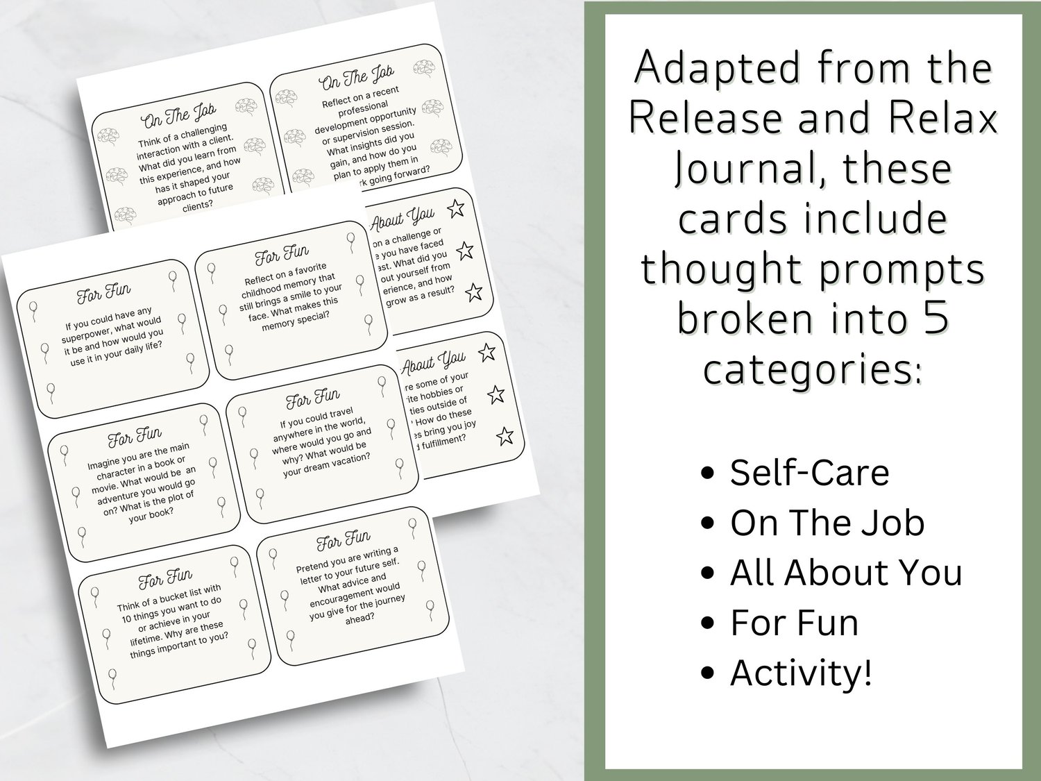 Adapted from the Release and Relax Bullet Jounral, these cards are broken up into 5 categories: