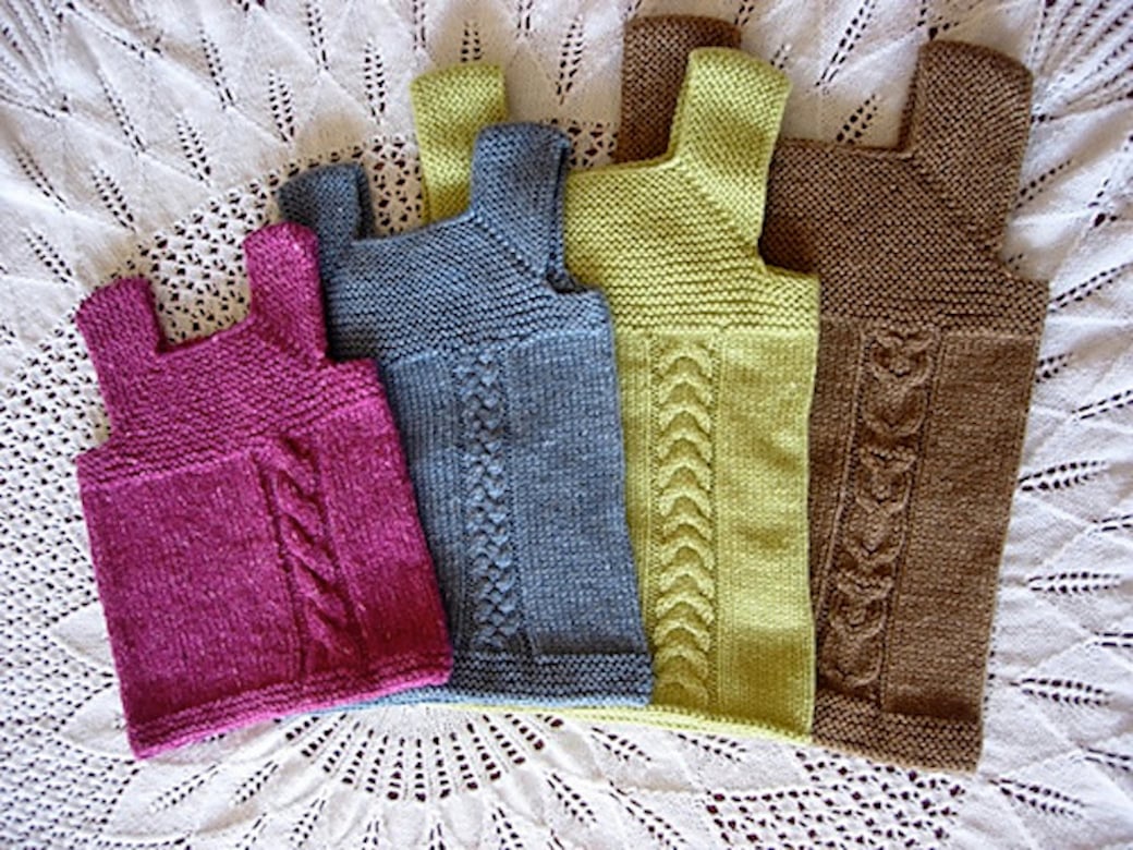You may wish to substitute the cable stitch pattern in the larger sizes to replicate the aesthetic of the smaller size. Some tips for doing so can be found here