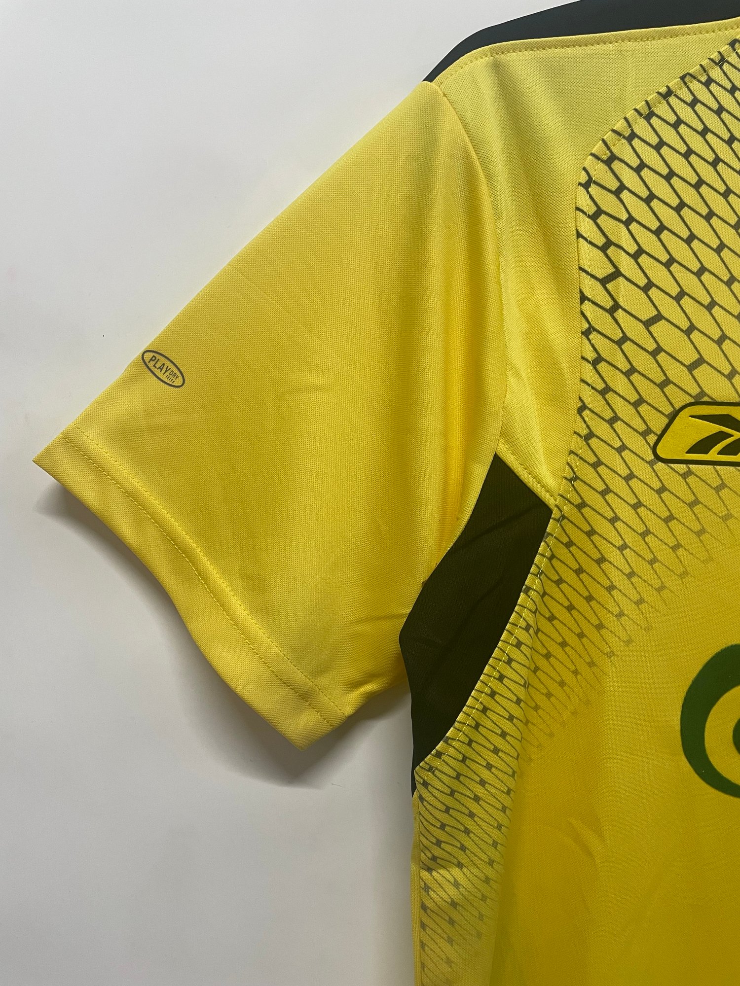 Step back into a golden era of Anfield history with the Reebok Liverpool 2004/05 Away Shirt, a striking design from the mid-2000s. Featuring a vivid yellow base accented by bold black paneling and a unique honeycomb graphic effect, this jersey embodied both flair and modern energy. Built with Reebok’s lightweight performance fabric, the shirt ensured comfort and breathability whether under the lights at Anfield or away in Europe. The embroidered Liverpool crest sits proudly on the chest, balanced by the Reebok logo and iconic Carlsberg sponsor, giving the shirt its authentic early-2000s identity.