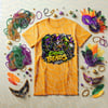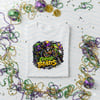 Designed with an edgy streetwear vibe, this artwork features masked characters decked out in classic Mardi Gras colors—purple, green, and gold—layered with beads, attitude, and celebration energy.