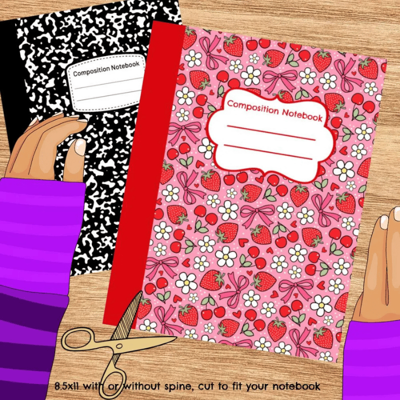 No more boring black and white composition books! This printable cover will make your notebook stand out! Size to fit any notebook up to 8.5x11- just print, cut and stick. Composition book measurements differ from brand to brand- you don't have to worry about sizing when you can cut it to fit perfectly.