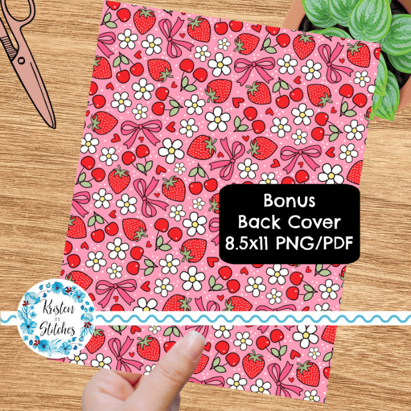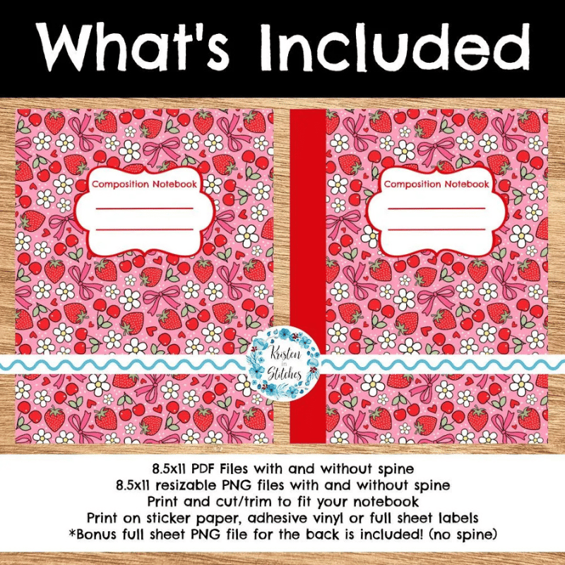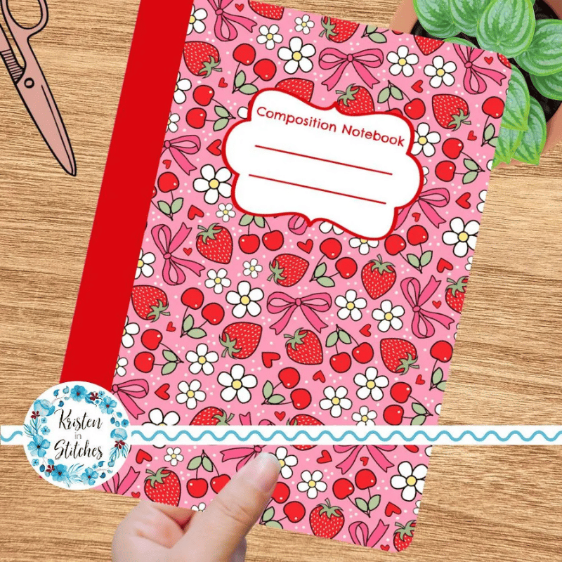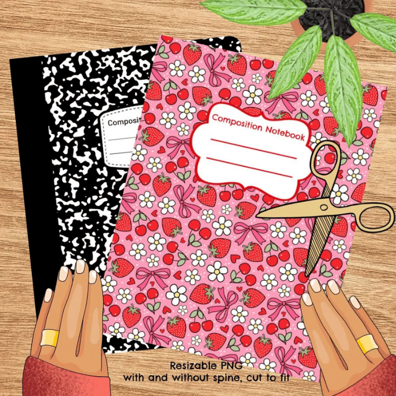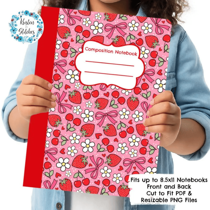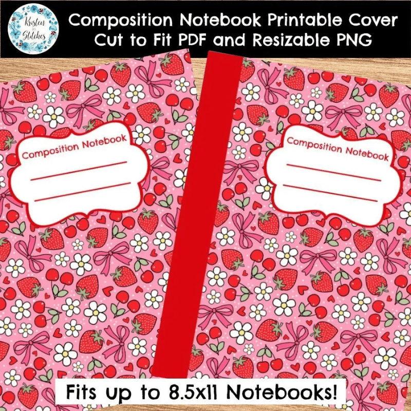 Composition Notebook Cover, Printable Resizable PNG, PDF, Strawberry and Cherry Coquette Bows