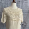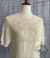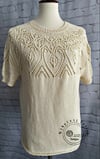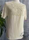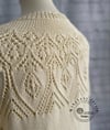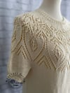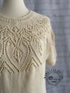 The Laurette Top worked from top down. The yoke is worked in sections of laces with increases in the round, followed by classic raglan increases when the stockinette stitch section begins. The sleeves are worked at the end, either on double-pointed needles or on circular needles using the Magic Loop technique. The top is finishing with iCord bind off.