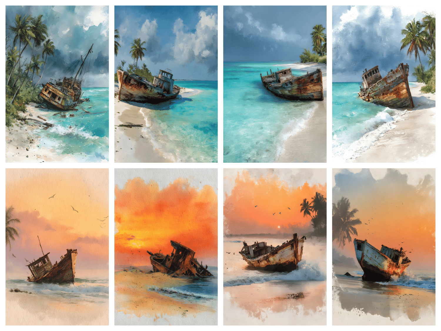 What You Get: Shipwreck Paradise – Tropical Beach Wrecks | Fantasy Ocean Art Bundle (10 Images)