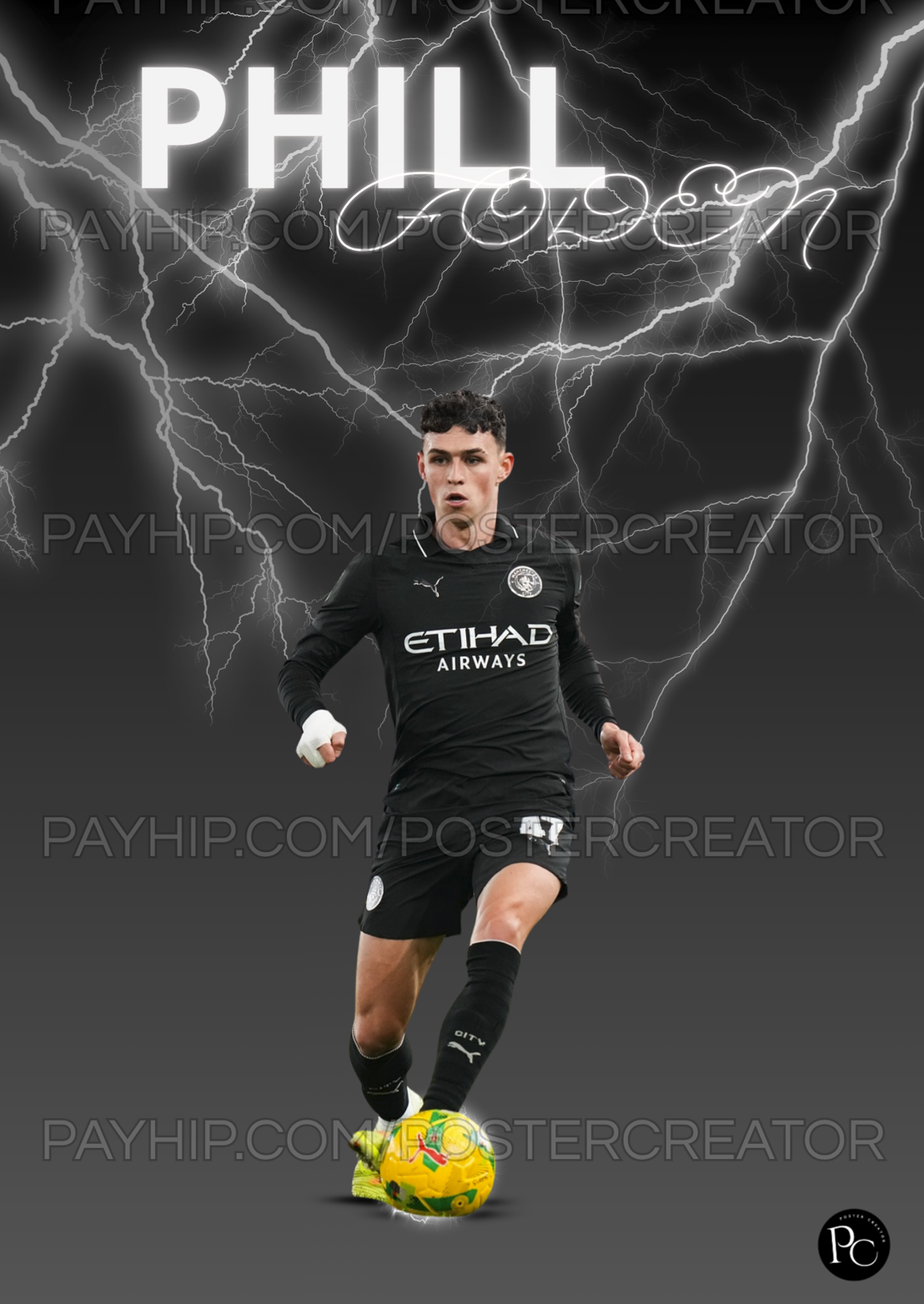 Talento Electrizante: Phil Foden, la Joya del Manchester City. Este llamativo póster destaca a Phil Foden con una intensa estética de tormenta y rayos, simbolizando su velocidad y destreza en el campo. Vistiendo el elegante uniforme oscuro del City, el diseño es moderno y lleno de energía. Una obra ideal para cualquier fanático del fútbol inglés y de los talentos generacionales. ¡Lleva la energía del "Stockport Iniesta" a tu pared!