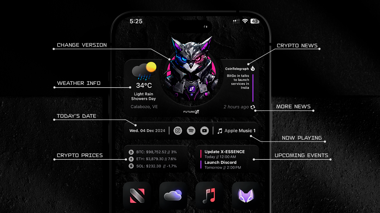 X-BOT: A customizable widget crafted for true tech lovers and futuristic style enthusiasts. With interactive information on weather, cryptocurrencies, calendar, and news, X-BOT lets you keep everything in one place while tailoring it to your preferences. Perfect for those who seek a unique visual experience and practical features on their screen.