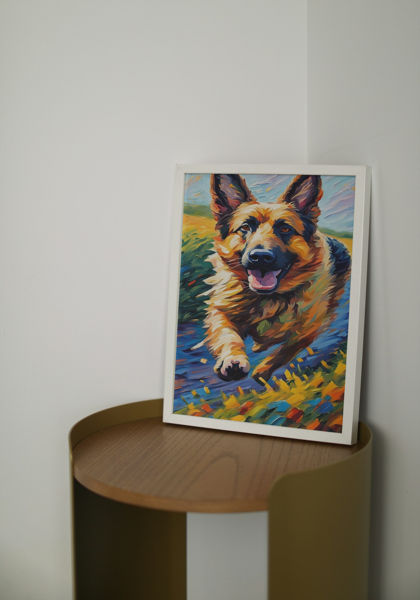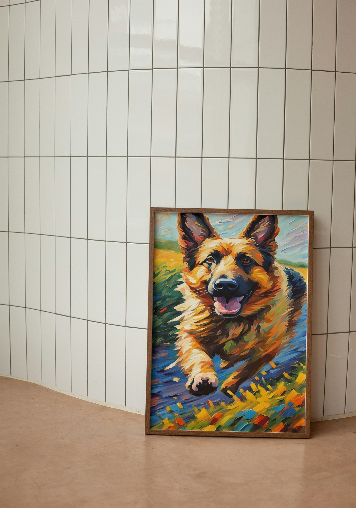 Celebrate strength, motion, and loyalty with this German Shepherd Running wall art, captured in an expressive neo-impressionist style. This high-quality digital artwork features a majestic German Shepherd in mid-run, brought to life with dynamic brush strokes, vivid colors, and a sense of unstoppable energy.