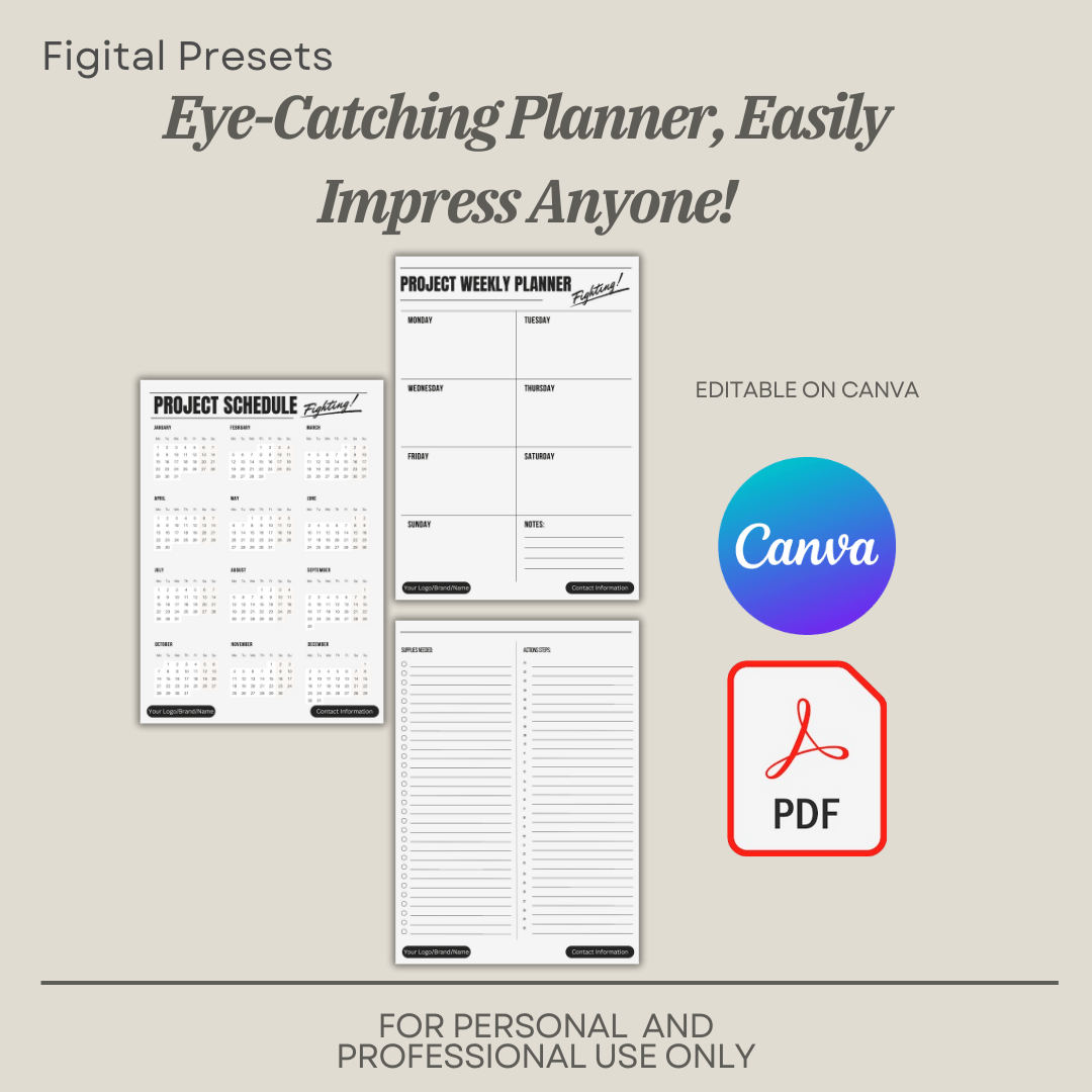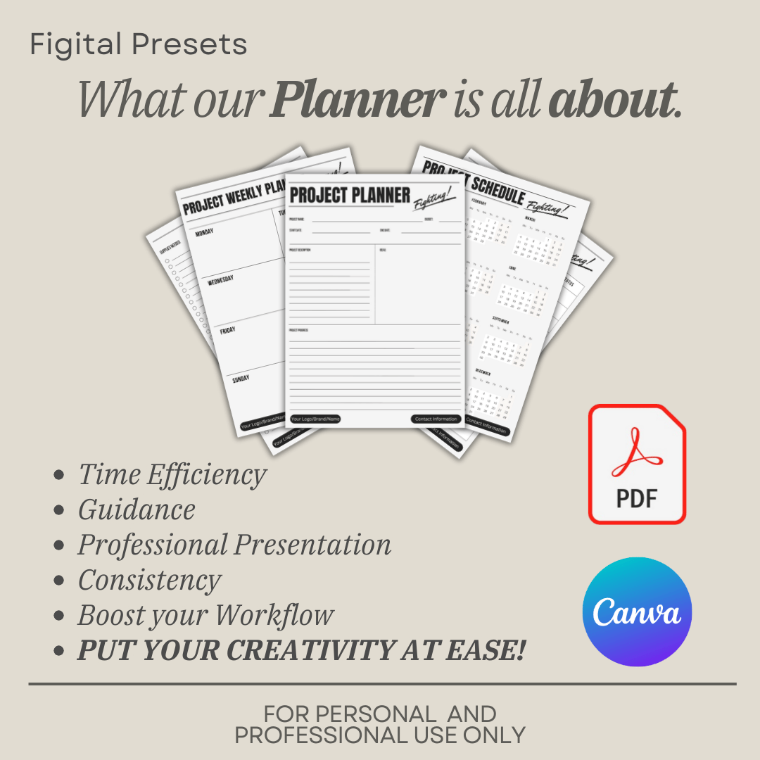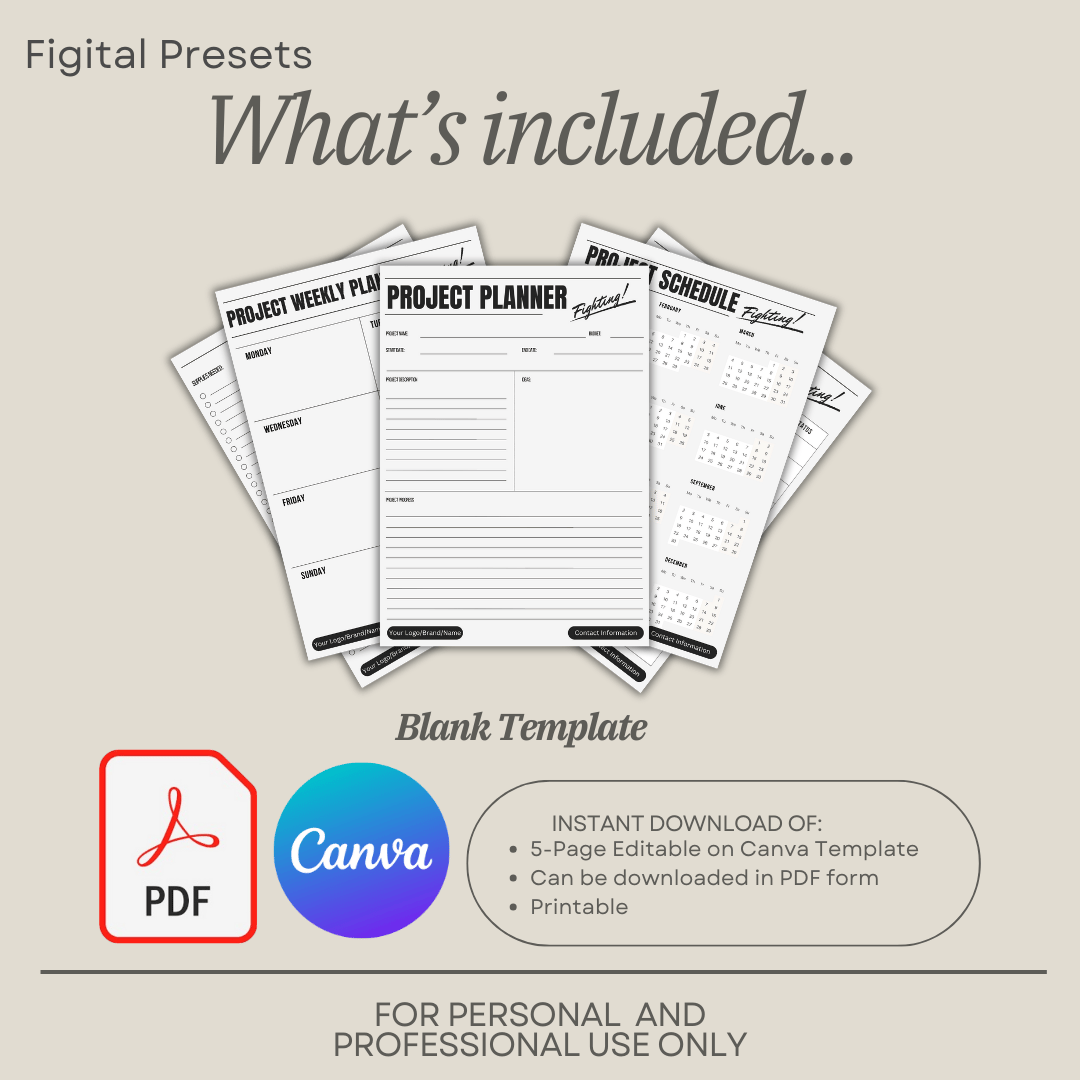 5-page template Project Planner, that are editable on Canva, and can be printed at home.