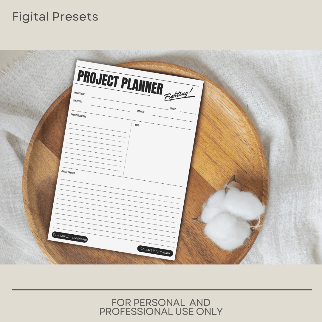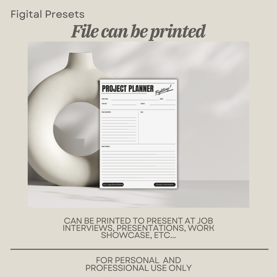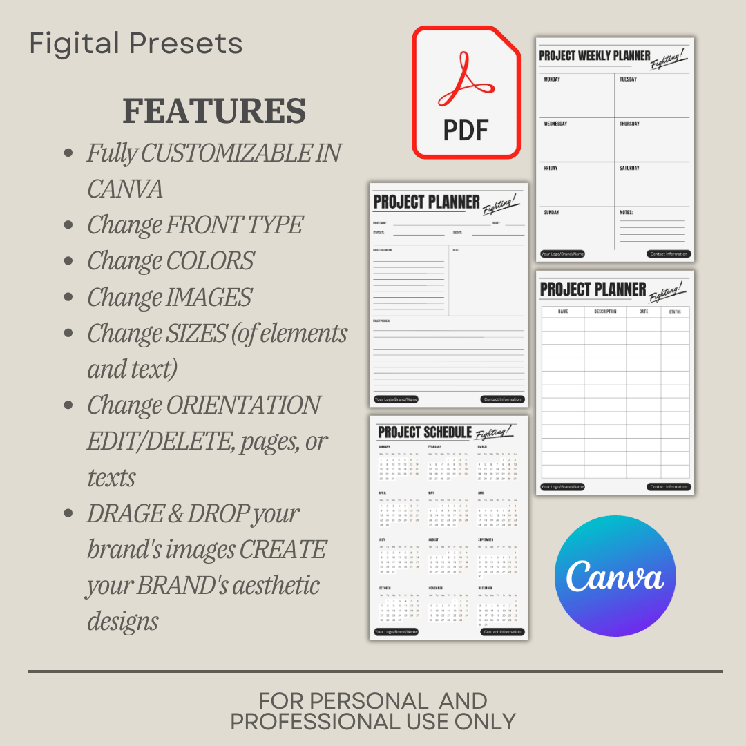 5-page template Project Planner, that are editable on Canva, and can be printed at home.