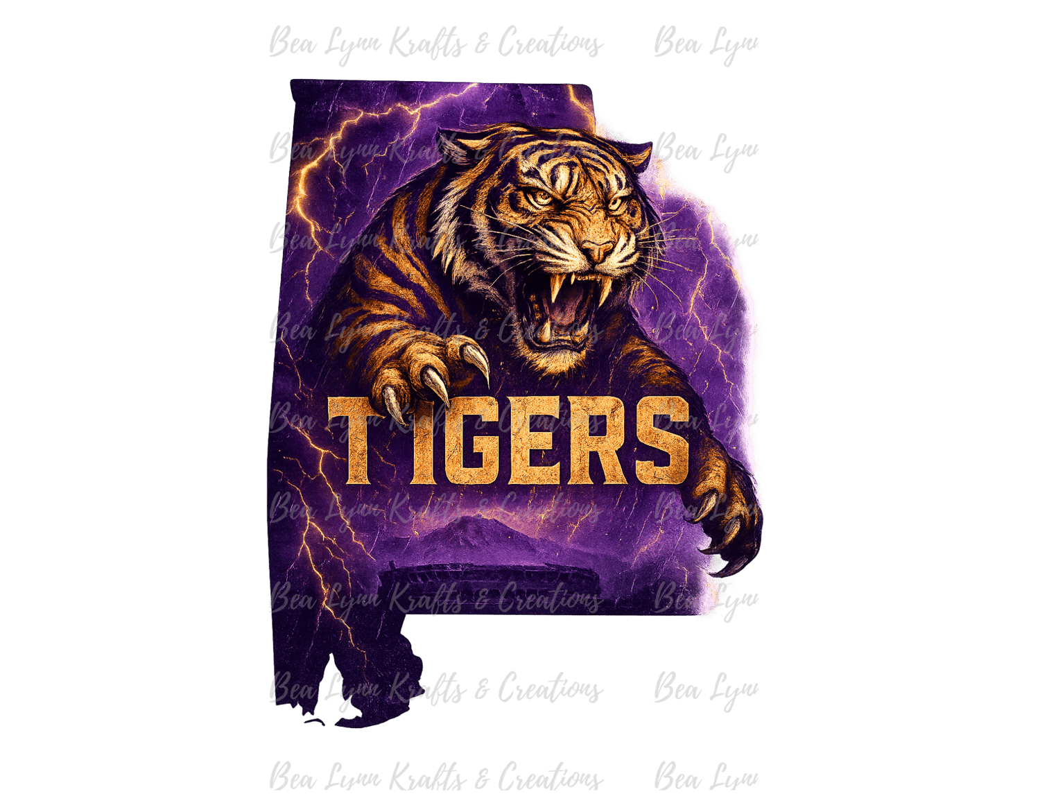 GEAUX TIGERS! This electrifying transparent PNG captures the ferocity of LSU football with unmatched energy. A roaring tiger bursts forward from the storm-textured outline of Louisiana, claws bared and eyes blazing with golden fury. The iconic “LSU” lettering boldly commands the center, while Tiger Stadium—Death Valley—rests subtly at the base, grounding this explosive design in Baton Rouge pride. Lightning arcs across the sky, rain pours down, and purple and gold dominate every pixel. This design is made for passionate fans who live for Saturday nights under the lights!