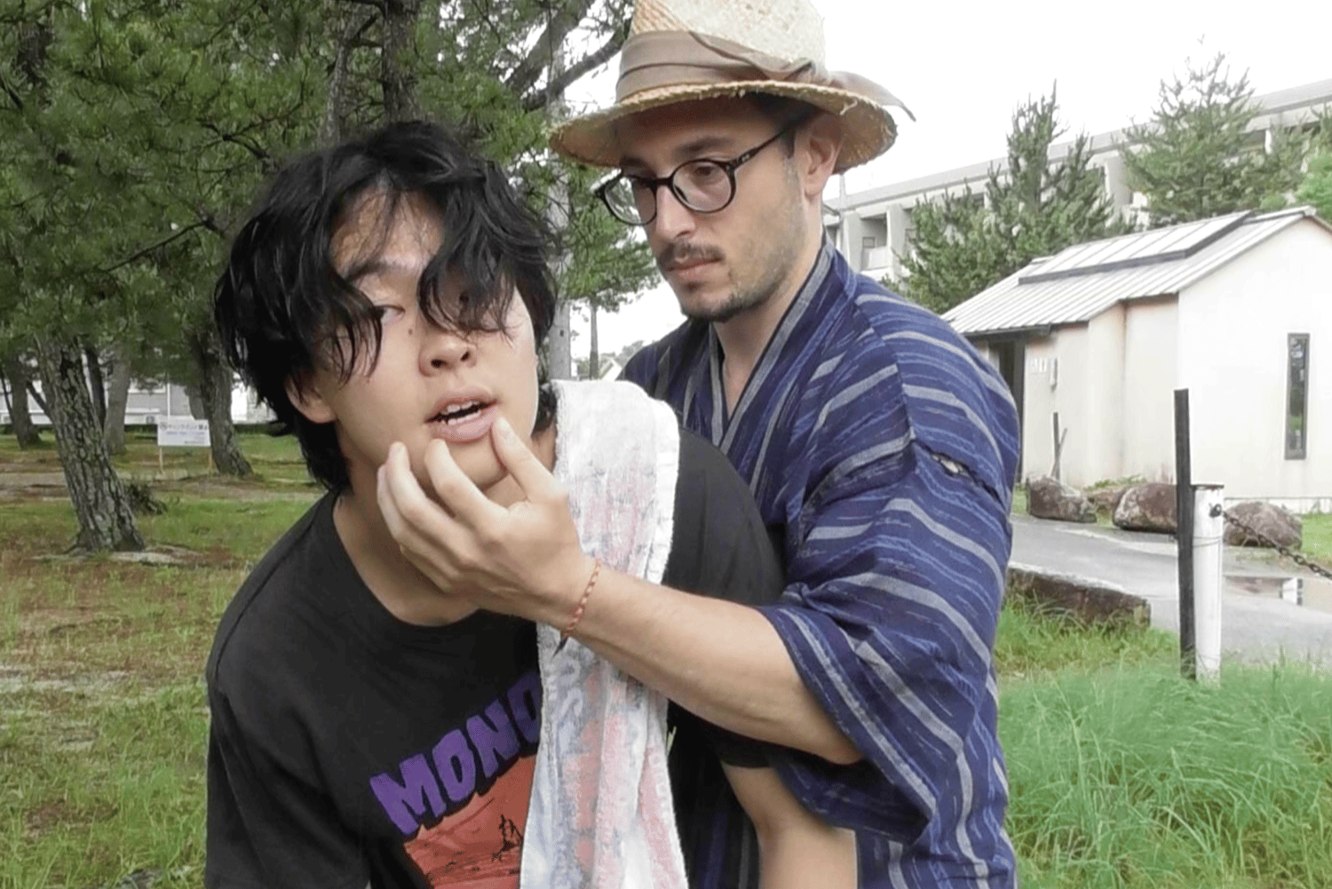 It starts raining and I freeze Junya while he talks about soccer and while he sits down on a rock. I also show his nipples and expose his feet. Finally I make him drink his tea and spill it all over.
