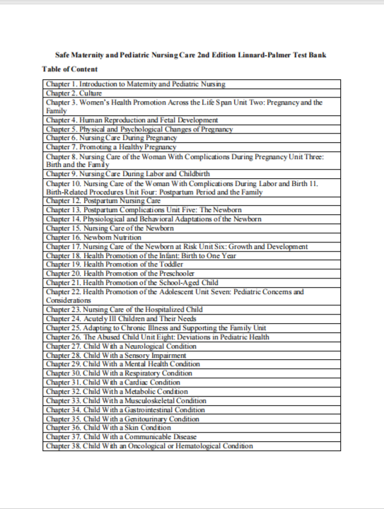 Perfect for students in maternal-child nursing courses, this test bank supports concept clarity, clinical judgment, and strong exam performance.