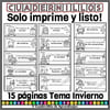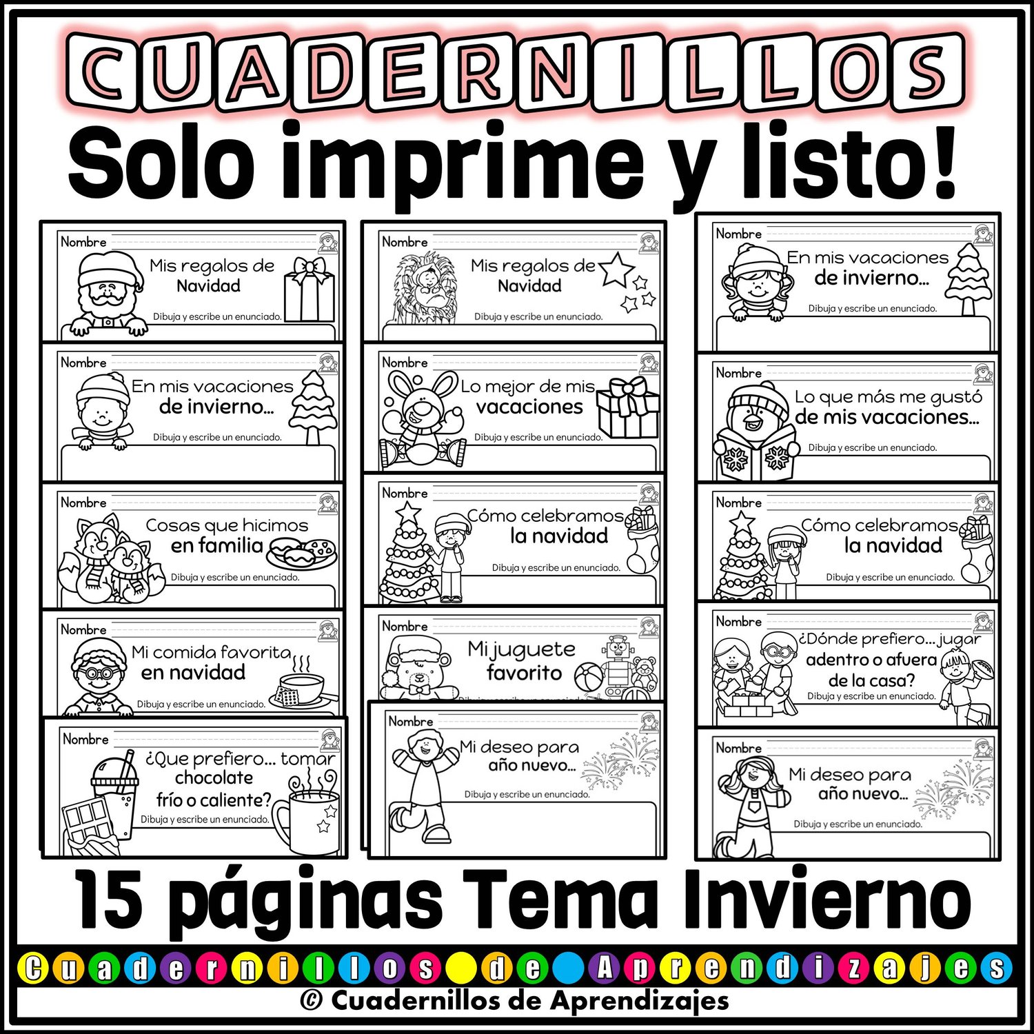 Hojas de trabajo para practicar la escritura creativa. Cada hoja incluye temas de escritura sobre navidad, año nuevo e invierno. Promueven la escritura de textos expositivos, narrativos y argumentativos.