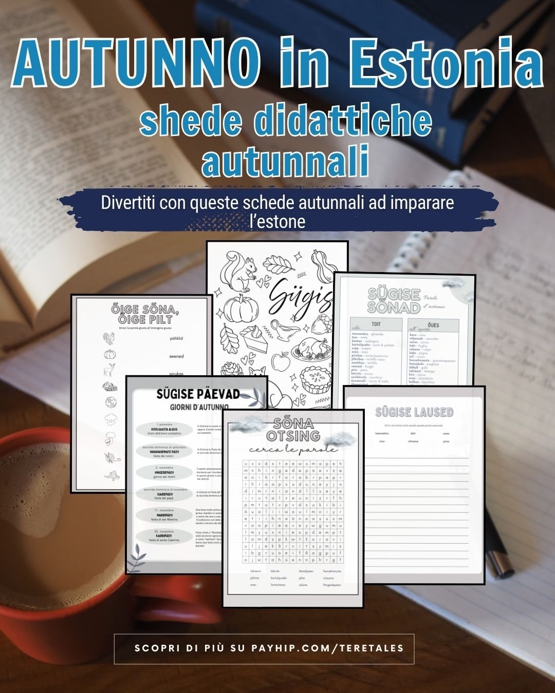 Schede didattiche a tema autunnale per imparare l'estone, per i bambini. Include: elenco vocabolario con parole autunnali, festività autunnali e date importanti in Estonia, esercizi e giochi. Impara l'estone facilmente per i bambini. Festività e celebrazioni estoni. Autunno in Estonia.