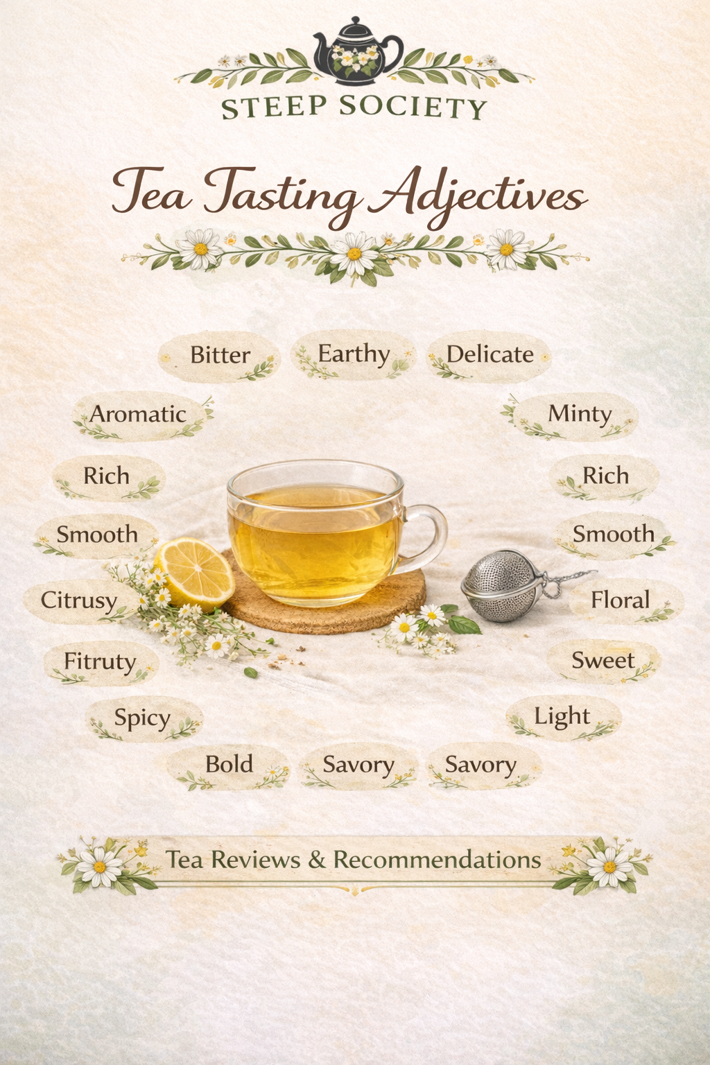 Our Tea Tasting Adjectives Sheet is designed to help tea lovers describe their tea experiences with ease. Whether you're sipping herbal teas, exploring loose-leaf blends, or writing tea reviews and recommendations, this guide gives you the language to match the moment. From floral and citrusy to bold and earthy, you’ll never be stuck searching for the right words again.