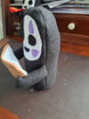 No Face's mask is hand stitched from felt, his body is black polar fleece and his book is felt. Stuffed with polyester and plastic beans so he can stand up on his own, this lil buddy just wants someone to love